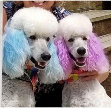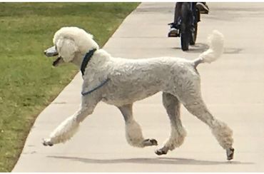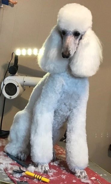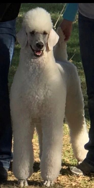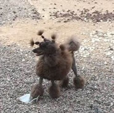 Ch Deblon's Code Talker "Brees" is sporting a scissored topknot, Continental style.